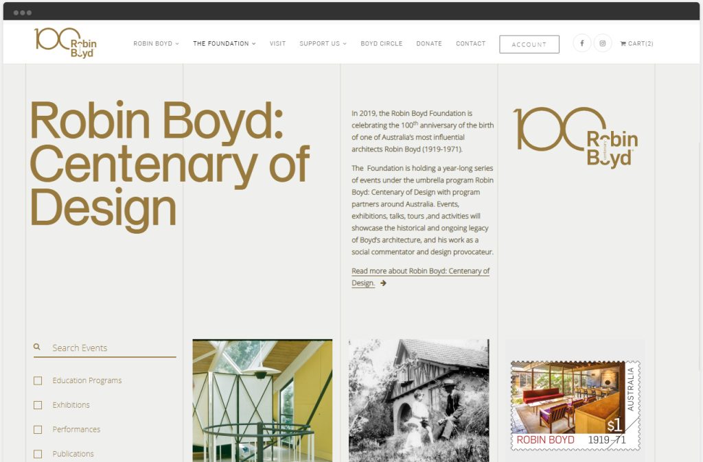 In Commemoration of 100 years since Robin Boyds birth, Creator Digital was commissioned to build an events page separate to the rest of the websites event system.